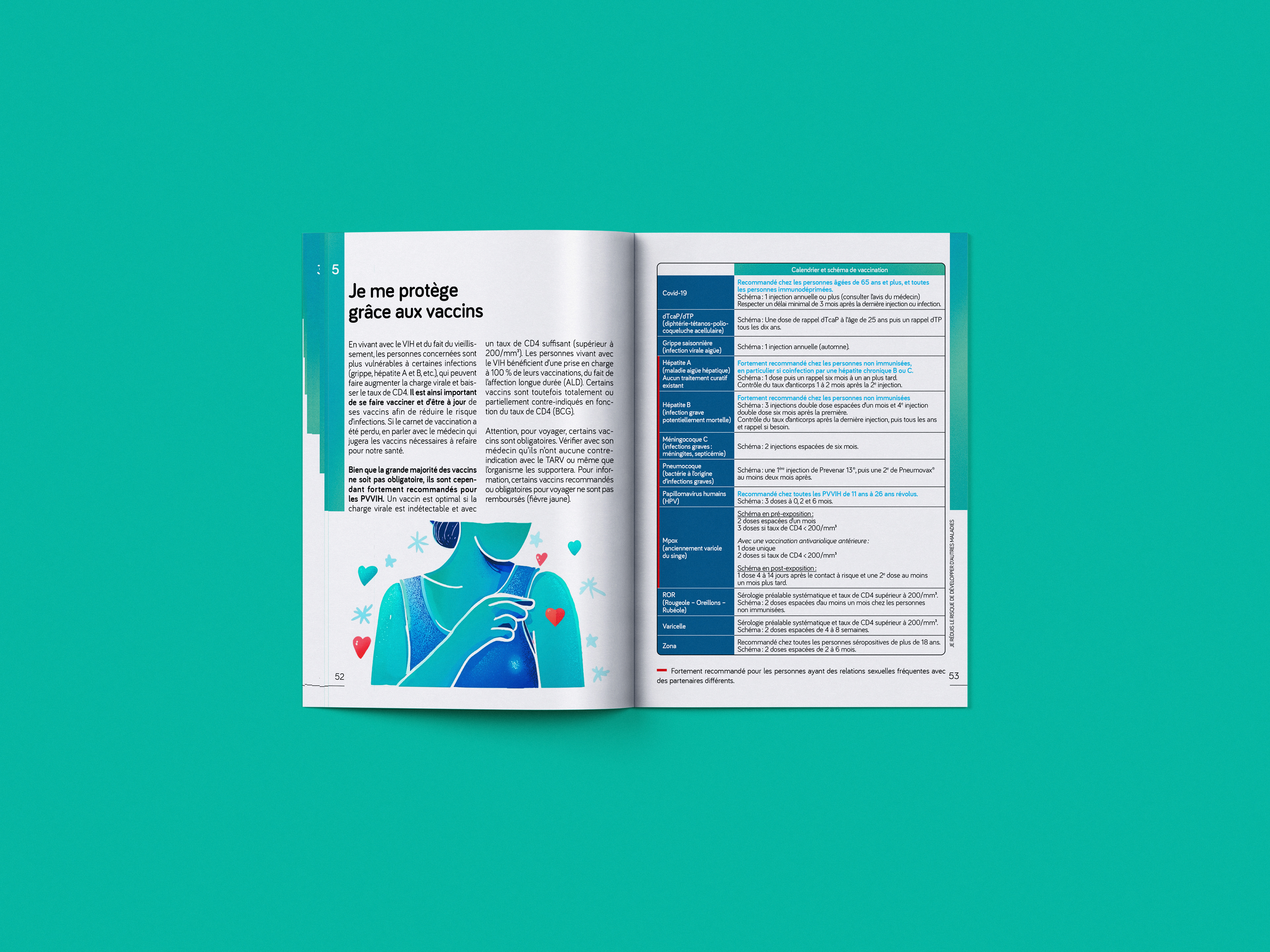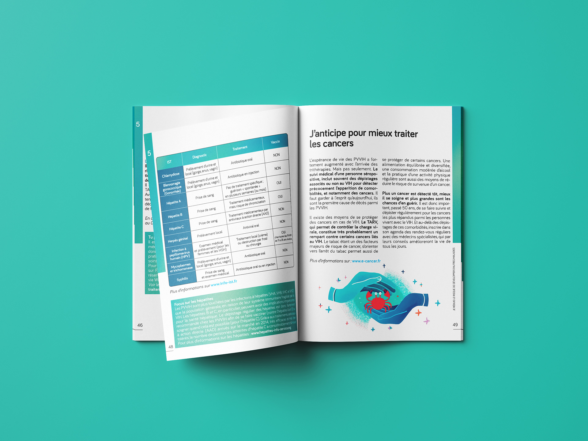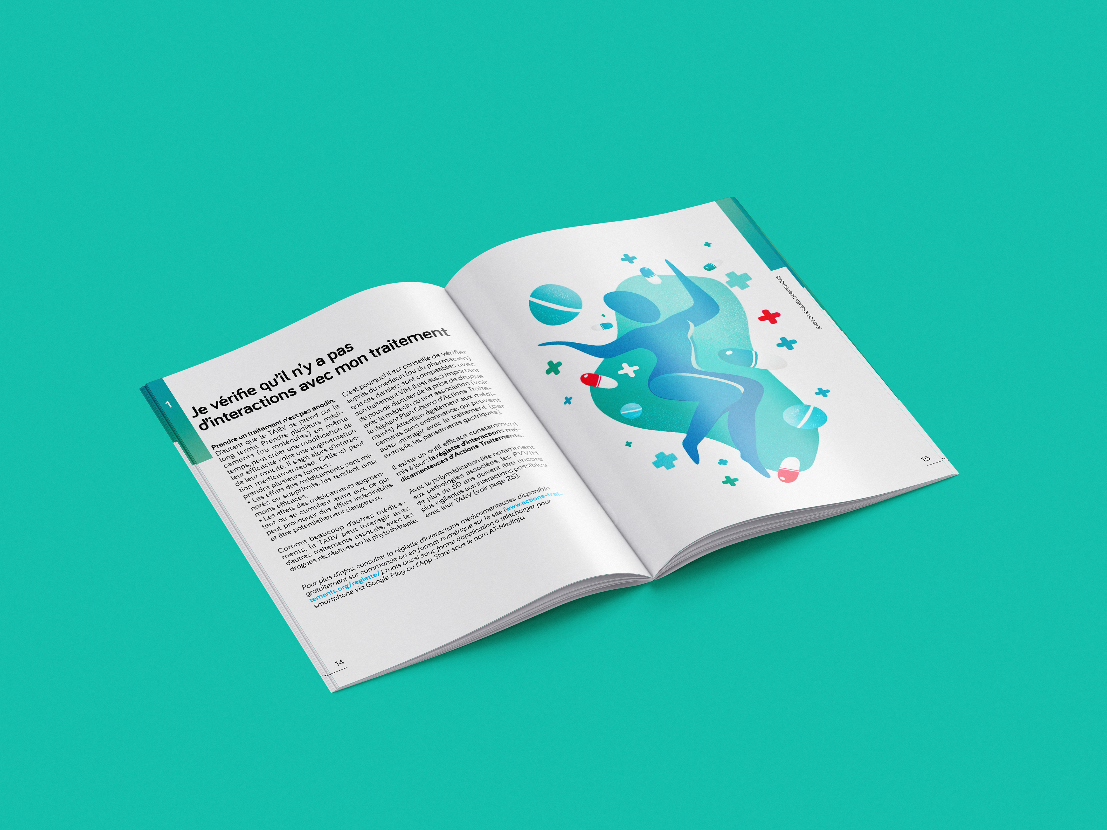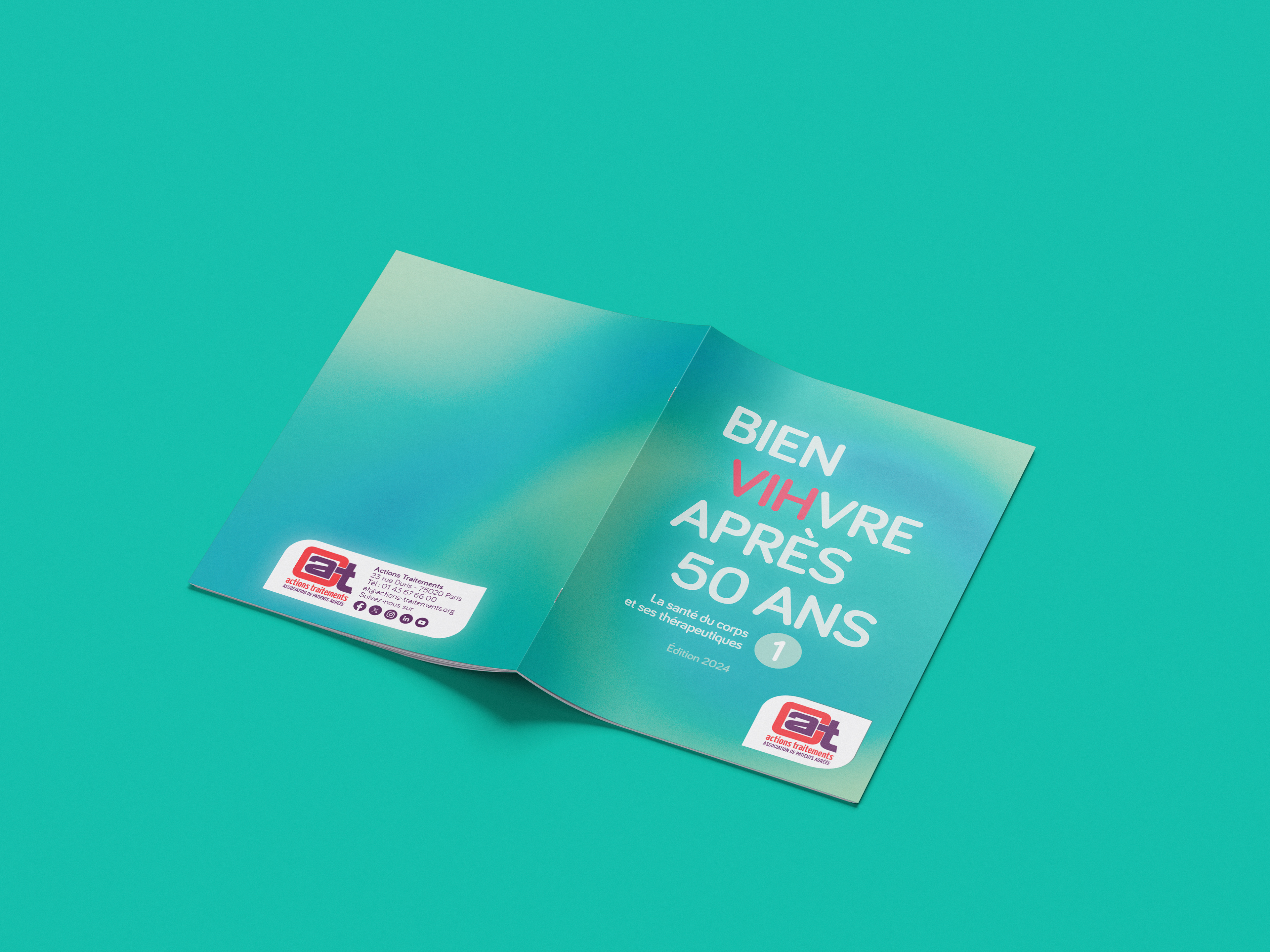 Plus tôt en 2024, Actions Traitements m'a confié pour mission de mettre en page le premier volet de la série "Bien VIHvre après 50 ans". Intitulée « La santé du corps et ses thérapeutiques », cette brochure au format A5 de 60 pages, composées avec l'aide de plusieurs structures et professionnel·le·s spécialisé·e·s dans l'accompagnement des personnes vivant avec le VIH, propose des réponses précises et bienveillantes aux nombreuses questions que l’on peut se poser sur :