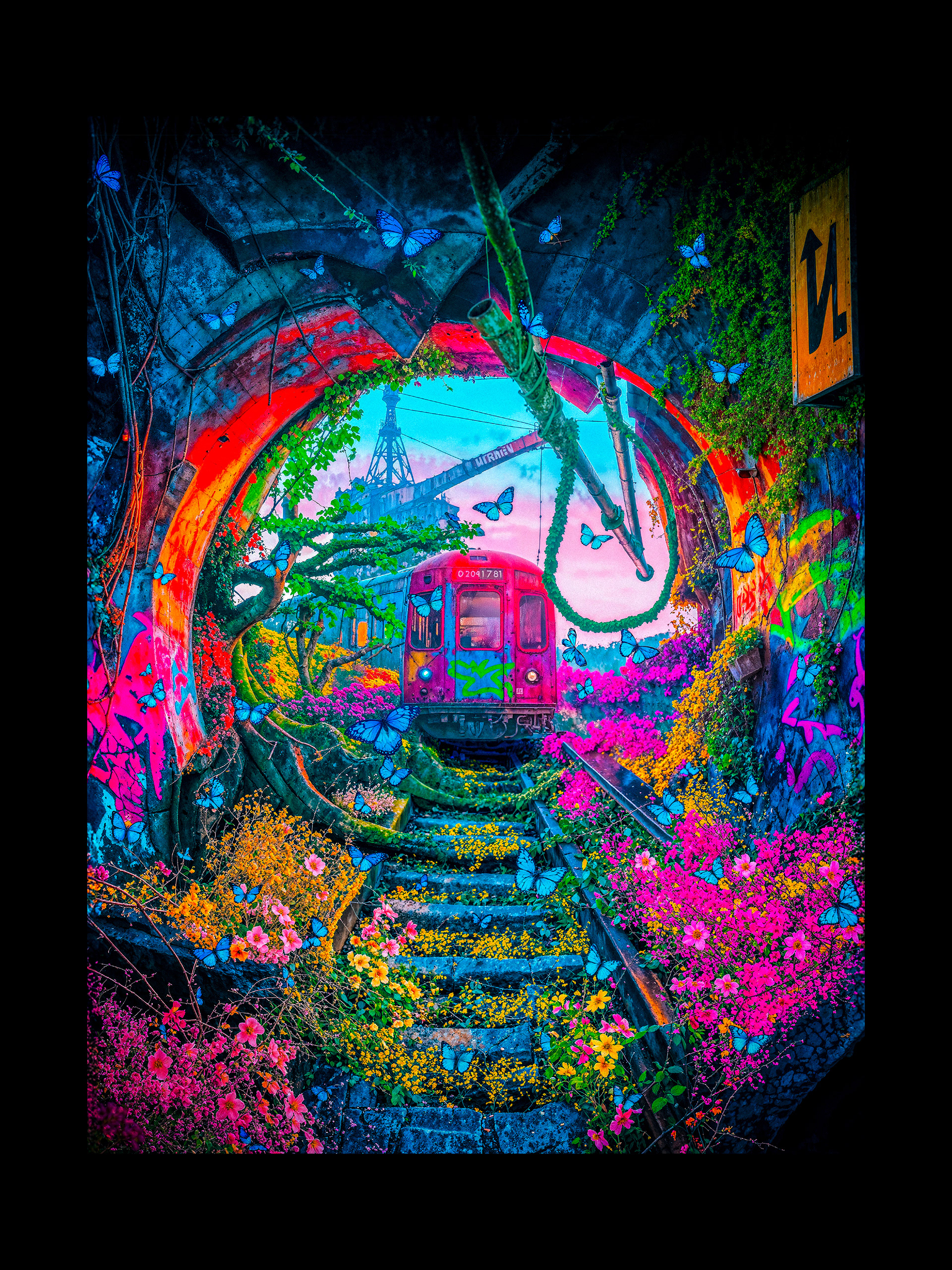 On continue sur la lancée des anamorphoses pour cette nouvelle saison de @chrysalide_party. Pour ce dixième rendez-vous (déjà !!!) nous nous retrouvons à la sortie d’un tunnel de métro abandonné, dans lequel la nature a repris ses droits. Le C de Chrysalide est, cette fois, composé de branches d’un vieil arbre robuste, d’une grue et de tuyaux abîmés. Je ne sais pas pour vous, mais de mon côté, ces champs de fleurs me donnent envie de faire une sieste rêveuse. 💐
