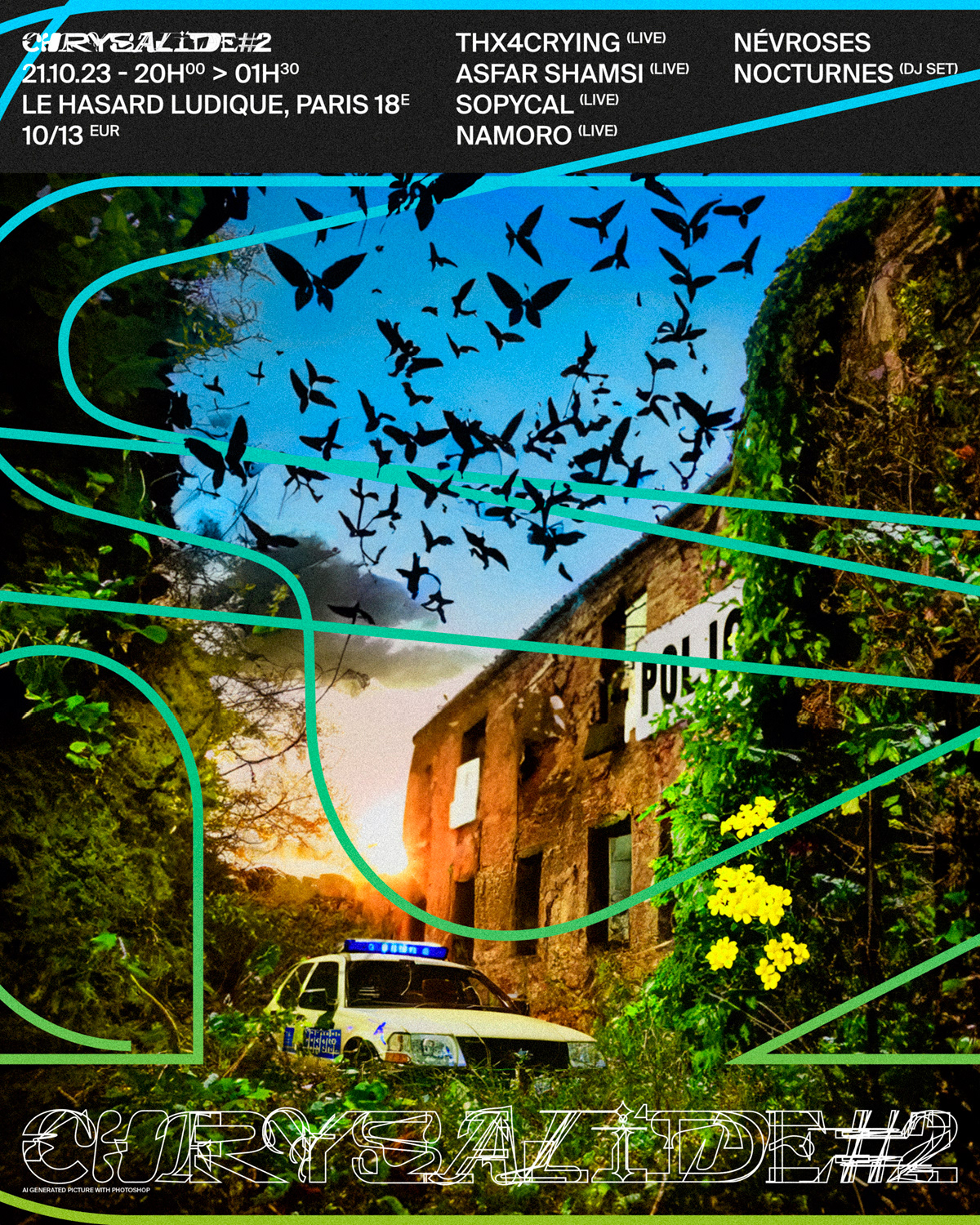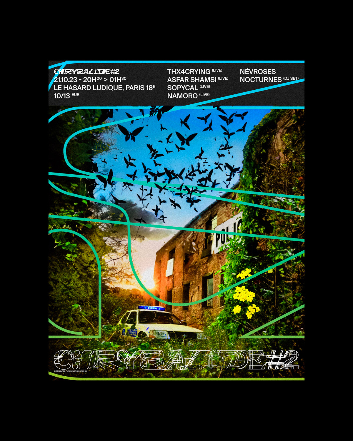 🐛🦋🌿🏢 @chrysalide_party #2 chez @lehasardludique par @kelyboy_music 🐛🦋🌿🏢 Plongeon à nouveau dans univers post-apocalyptique entre béton et nature, où tout est à (re)construire, et cette fois-ci sans les erreurs du passé ; une manière d'éclore à nouveau et de se réapproprier le monde. Image de base créée sur @photoshop avec Firefly @adobefrance, accompagnée d'une typo hybride composée par mes soins 🖼 Visuel #1 accompagné des explications de base disponible dans mon portfolio. Prêt·e·s pour le Round #3? 👀