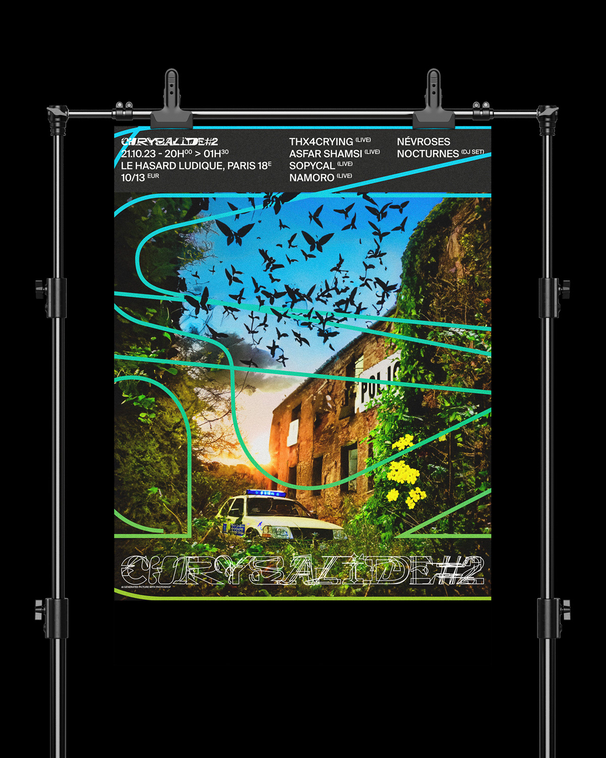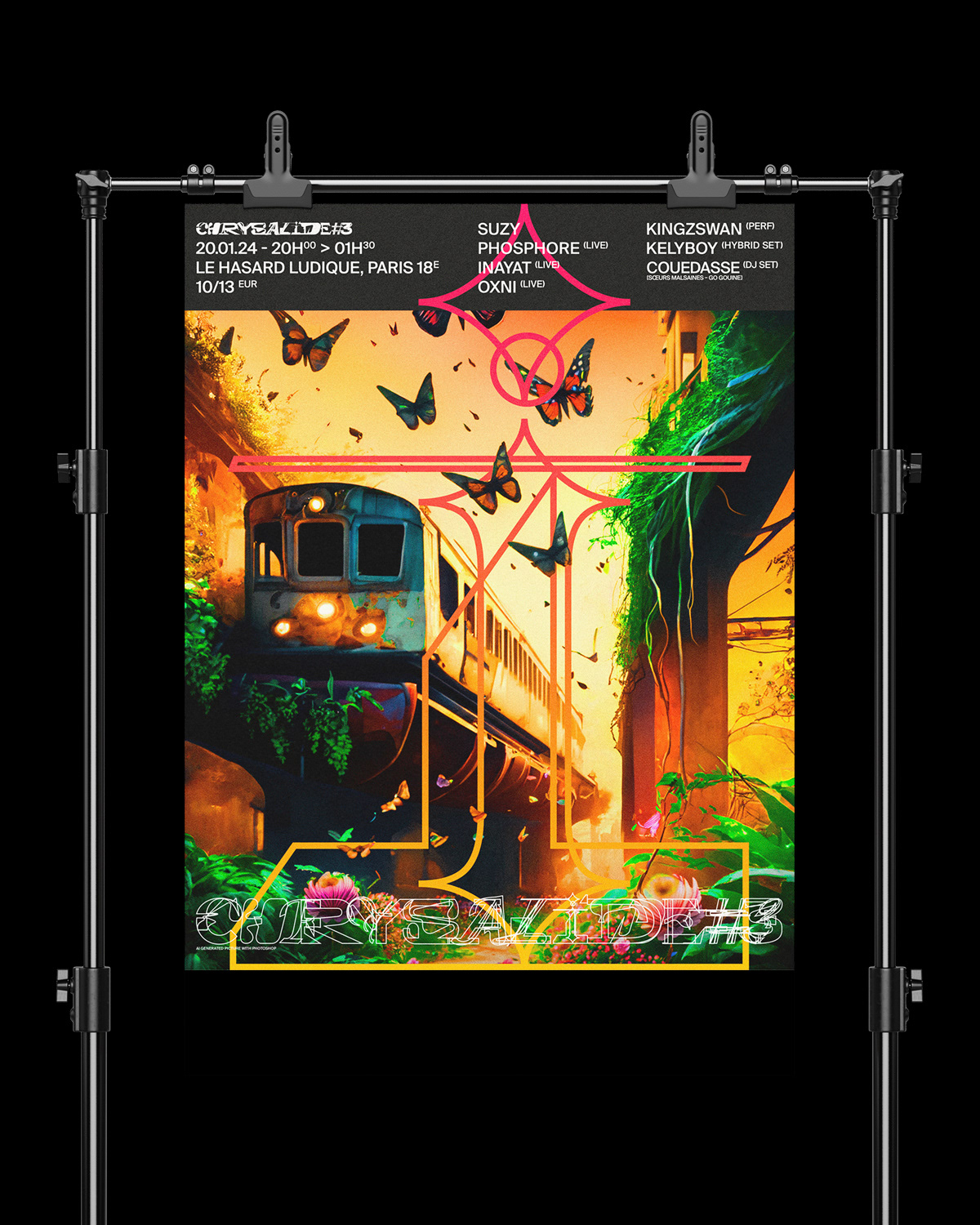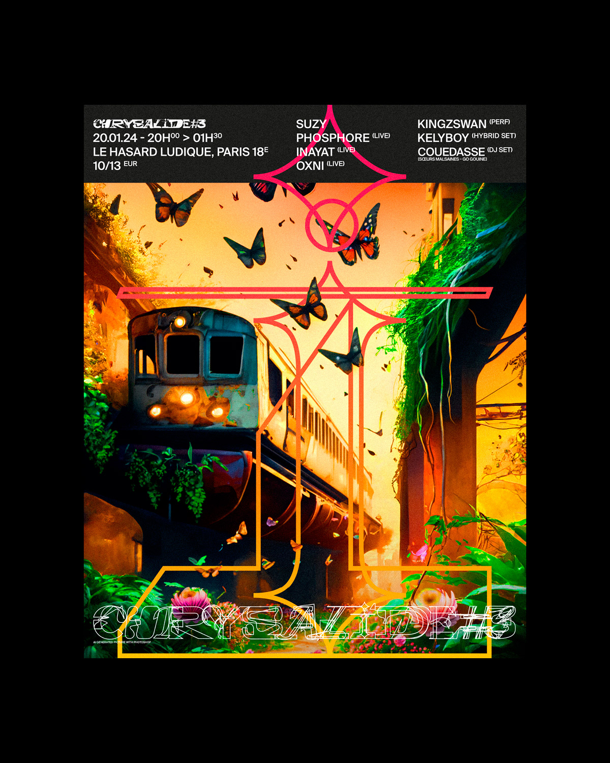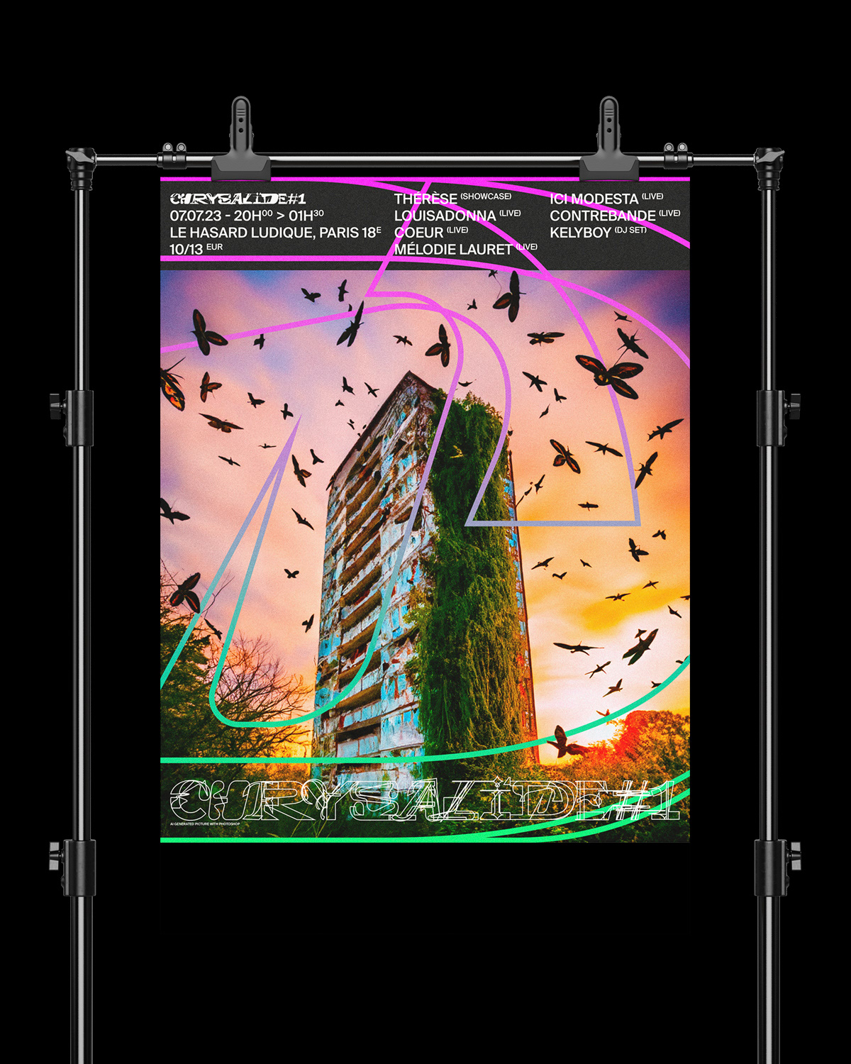 🐛🦋🌿🏢 @chrysalide_party #3 chez @lehasardludique par @kelyboy_music 🐛🦋🌿🏢 Troisième visuel de la série, pour la soirée du 20 janvier 2024 avec @suzy_phosphore26, @inayatmusique, @oxni__, @couedasse, @kingzswan et the one and only MC de la soirée KELYBOY! Une fois de plus, bienvenue en 2048, après que l’être humain ait atteint les limites de sa bêtise, et que la reconstruction d’un nouveau monde entre béton brisé et nature verdoyante ayant repris ses droits soit prise en charge par des ex-minorités opprimées, afin d’éviter à nouveau la suprématie des con·ne·s. Image de base créée sur @photoshop avec Firefly @adobefrance, accompagnée d’une typo hybride composée par mes soins. En bonus, retrouvez les deux autres visuels réalisés précédemment, pour plonger dans l’univers visuel global que nous avons choisi d’installer 🖼️