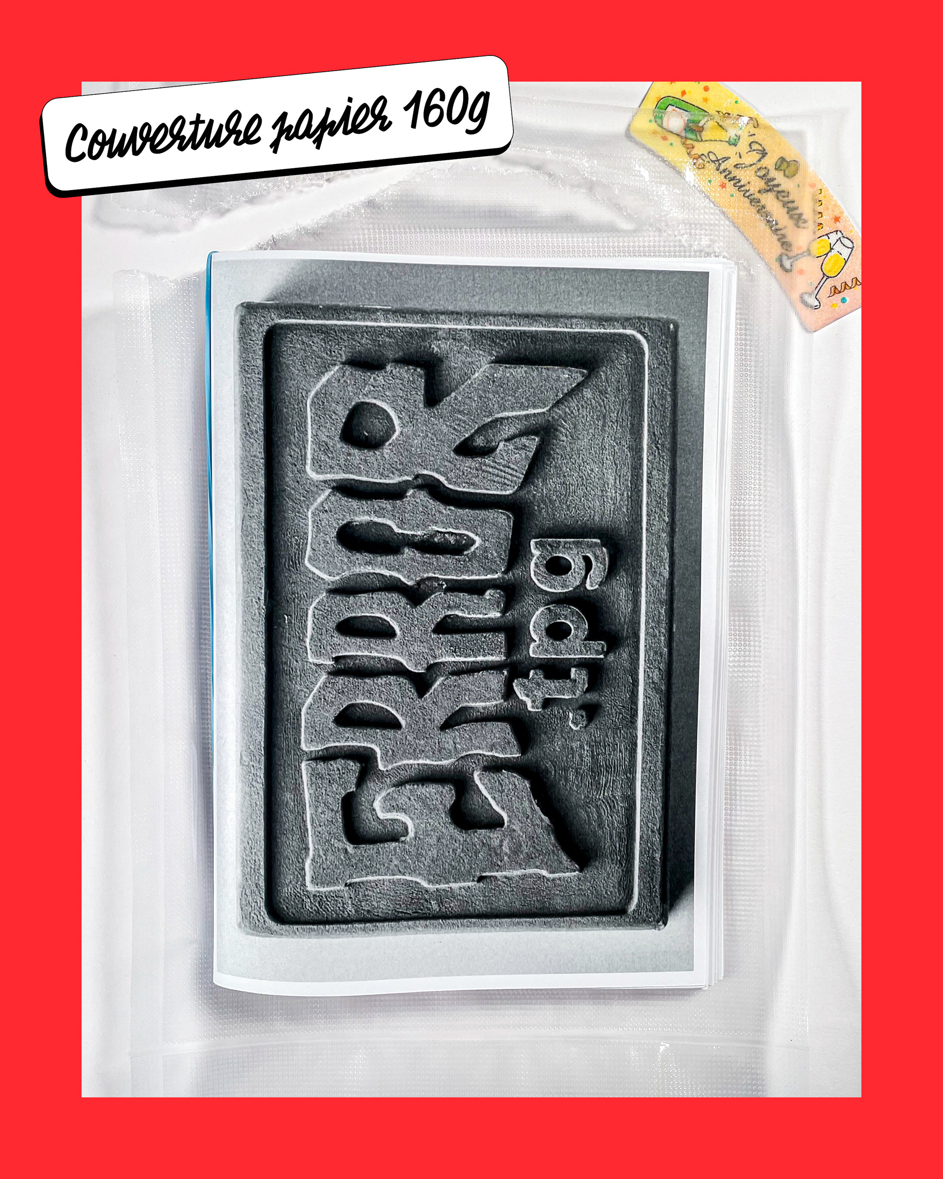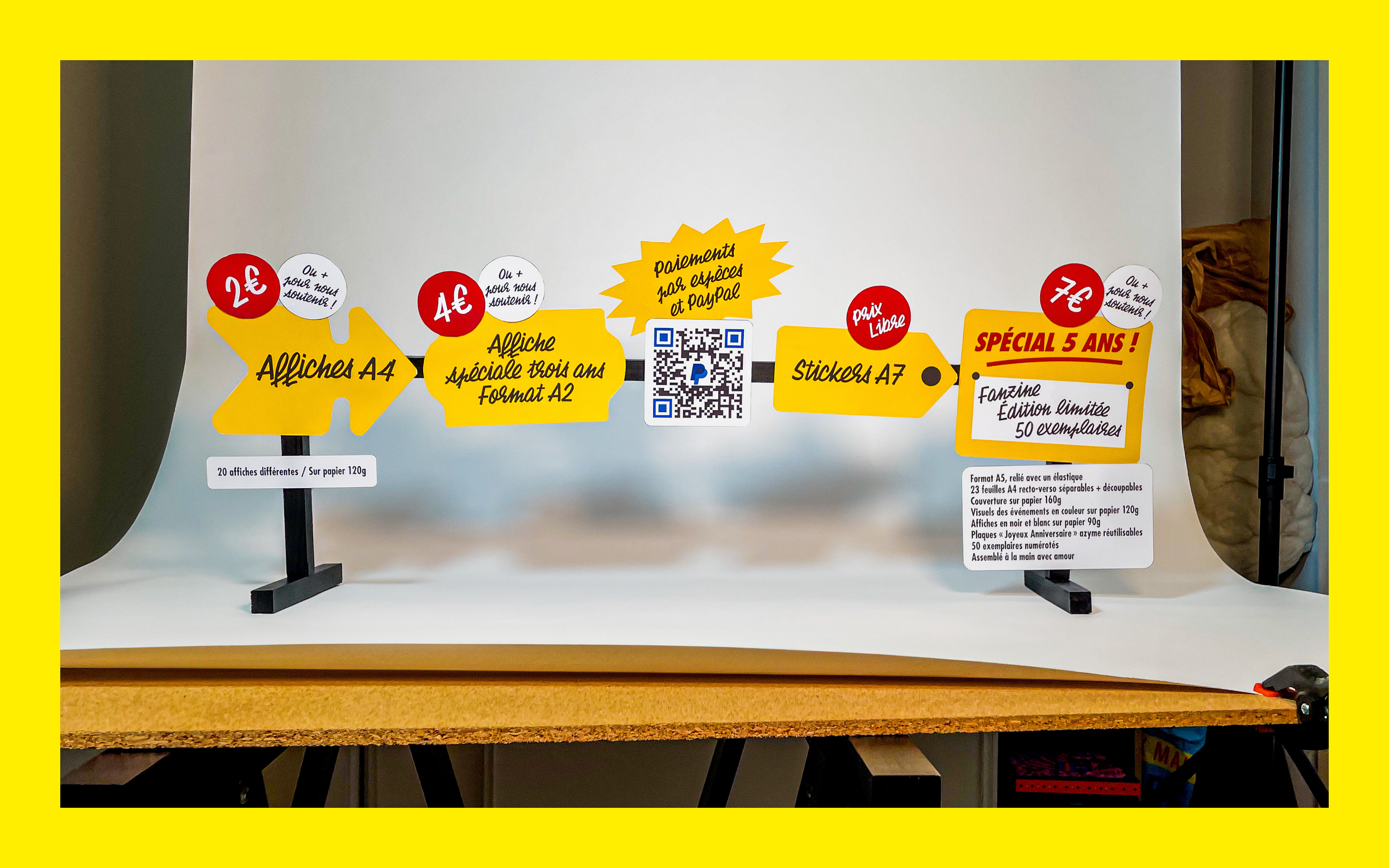Il réunit tous les visuels de nos événements passés en couleur sur papier 120g et une grande partie de nos posters en noir et blanc sur papier 90g. Son design unique comprend 23 feuilles A4 recto-verso, détachables et découpables, reliées par un élastique pour un feuilletage libre. La couverture en papier 160g protège l’ensemble, et en clin d’œil festif, des plaques « Joyeux Anniversaire » en azyme réutilisables et comestibles viennent compléter l’objet. Le tout a été assemblé à la main par mes soins et avec amour puis placé dans un sac sous vide, qui facilite le transport jusqu’à chez vous et vous offre la possibilité de préserver le contenu en vue d’une ouverture ultérieure. En bonus dans cette présentation, un aperçu de notre stand au salon Vendetta, avec le présentoir à prix que j’ai fabriqué à la main spécialement pour l’occasion. ❤️