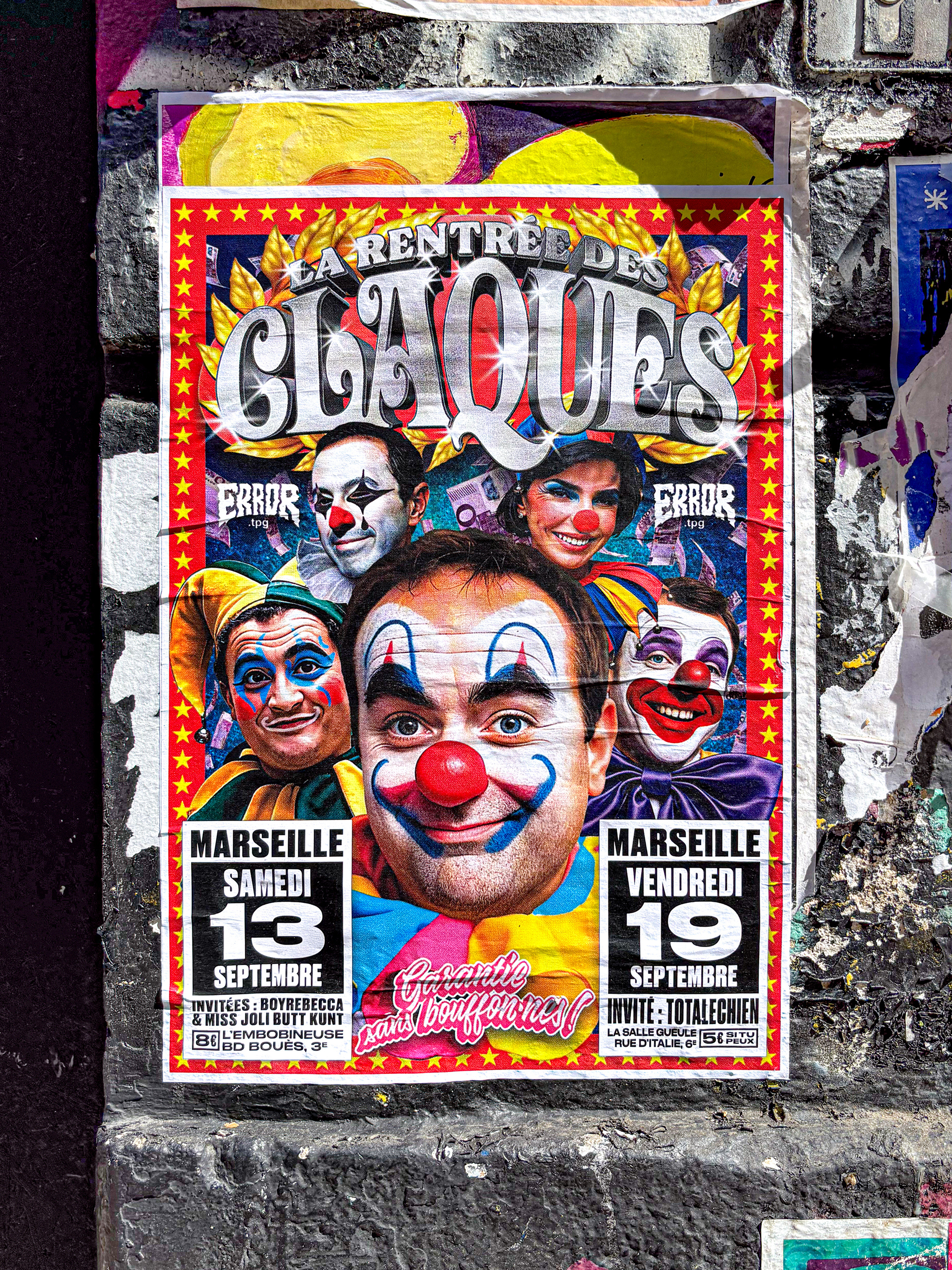 Nous étions franchement déprimés à l’idée de retourner bosser, surtout face à une rentrée politique qui donnait envie de se taper la tête contre les murs (a-t-on seulement eu un répit avec toutes ces mesures insipides annoncées par François Bayrou en plein été ?). Depuis un moment, j’avais aussi envie de rendre hommage à la culture du cirque, qui m’a toujours fascinée. J’ai donc croisé les deux en imaginant la rentrée de nos clowns-ministres sous le chapiteau tricolore : une énième représentation sans saveur sous les projecteurs, lourde et ultra-cringe, pleine de pirouettes ratées et de vannes indécentes qui ne font plus rire, avec en prime un lancer de tartes à la crème sur le public. Et hop : la Rentrée des Claques était née.