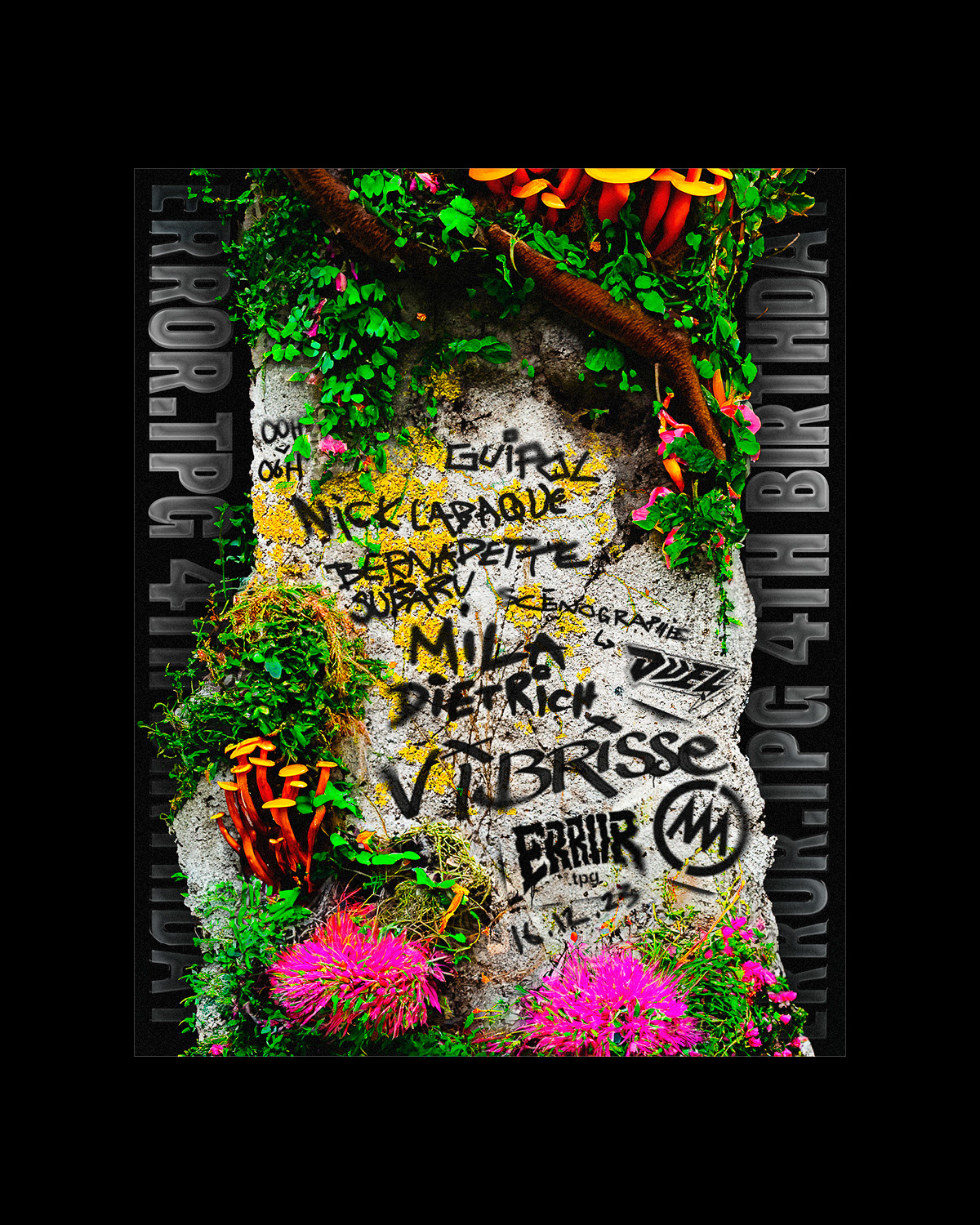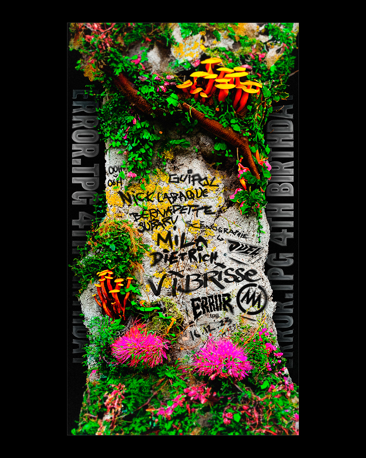 🌺🍄🌿 @error.tpg : QUATRE ANS 🌿🍄🌺 Aurais-je pensé écrire un jour que mon collectif passerait par la case quatre ans? Par impossibilité de me projeter moi-même dans le futur, la réponse est non. Et pourtant, nous y voilà! Rendez-vous avec @vibrisseduo, @miladietrichmusic, @lostinadulation + @ugobazuko (DUEL) pour la scénographie, et @guipol.gpl, @nick.labque et myself @bernadette.subaru, chez @metaphore.collectif (et c’est un véritable honneur 🙏) / Visuel fixe conçu avec assistance de l’IA de @photoshop, et passage par la tablette graphique pour les graffitis de jeunes déliquant·e·s ; avec en tête l’idée de reconstruction spontanée par-dessus des restes façon Mère Nature. On peut voir dans le mur détruit et le sale une incarnation de l’échec humain, dans les graffitis pourris une façon de représenter la réappropriation, et dans les plantes vives et les champignons poussant partout la perfection de la nature qui récupère ce qui lui appartient, éternel recommencement merveilleux 💪. Pour la 3D, petit passage du visuel fixe dans LeiaPix par @leiainc. Musique: « kerokerosene » par @vibrisseduo 🌿🍄🌺