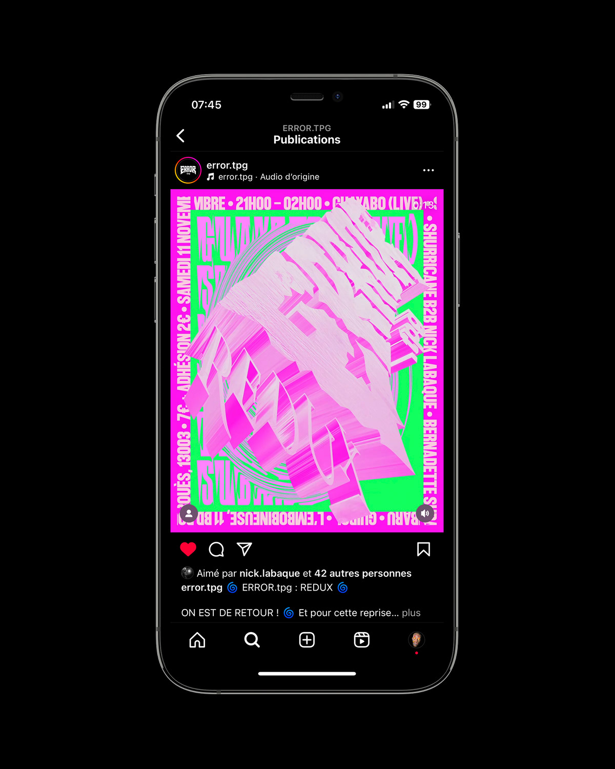 🌀 @error.tpg : REDUX / avec @honxo_xoxo_ et @saul_entoutgenre 🌀 Visuel et campagne visuelle pour le retour en force de mon crew ERROR.tpg le 11 novembre 2023 à @lembobineusemarseille, après sept mois à essayer de faire passer la haine en nous pour focaliser sur un renouveau. On s’est dit qu’il n’y avait rien de mieux que prendre des couleurs bien flashy pour l’occasion et ce serait cool de faire quelques affiches pour marquer le coup. Donc je suis parti dans l’idée de faire un visuel print DIY en noir avec une trame stochastique sur papier fluo rose et vert, qui donnerait envie de regarder le visuel de près en détail. On en a collé dans Marseille centre pour la promo, les avez-vous vues? Il en reste encore quelques unes dans des recoins si vous cherchez bien 👀 Musique par @honxo_xoxo_ « She’s A 7 AND An Ex H•e » 🎵 Trame réalisée avec @stochaster_app 🖼️