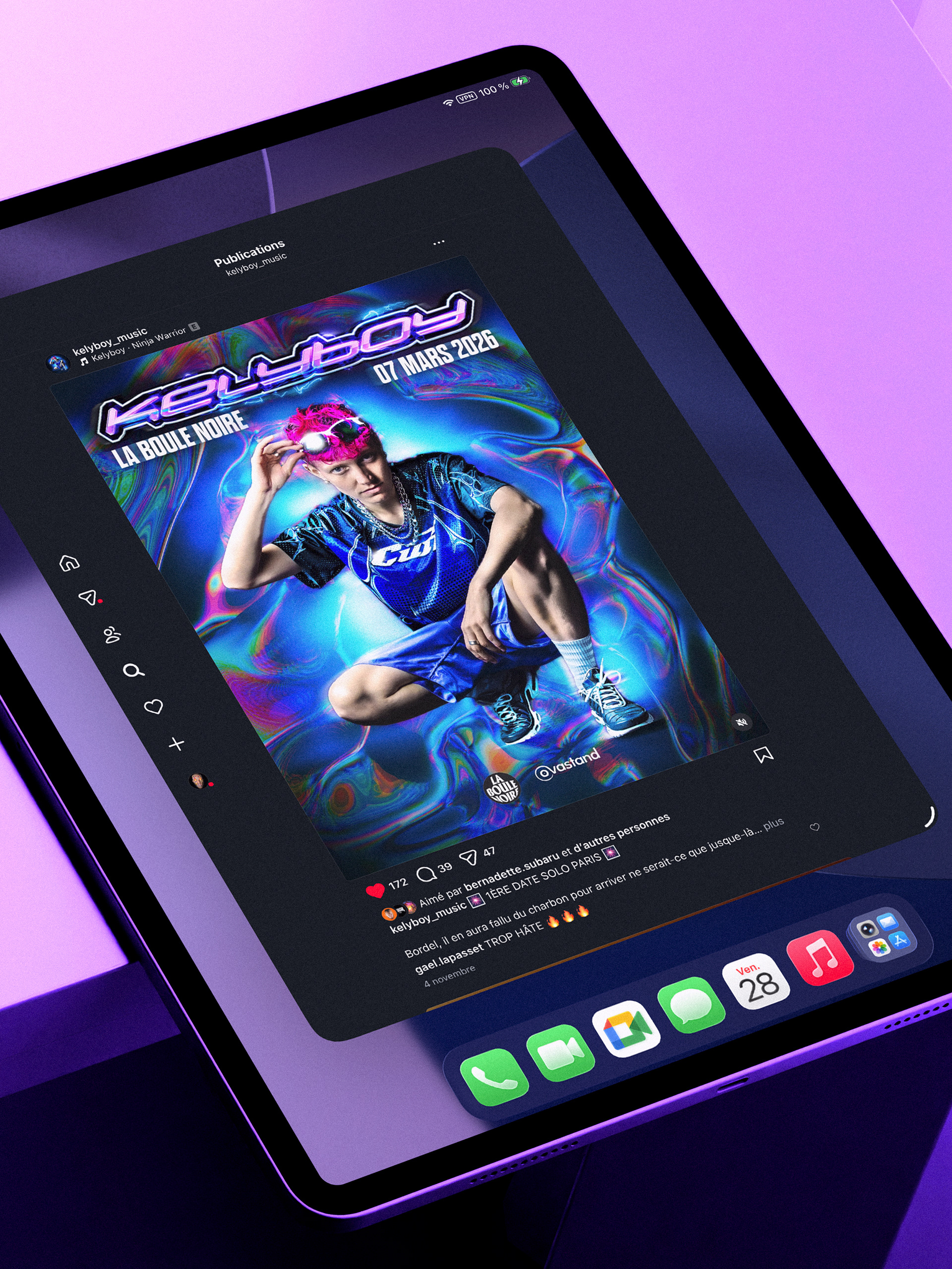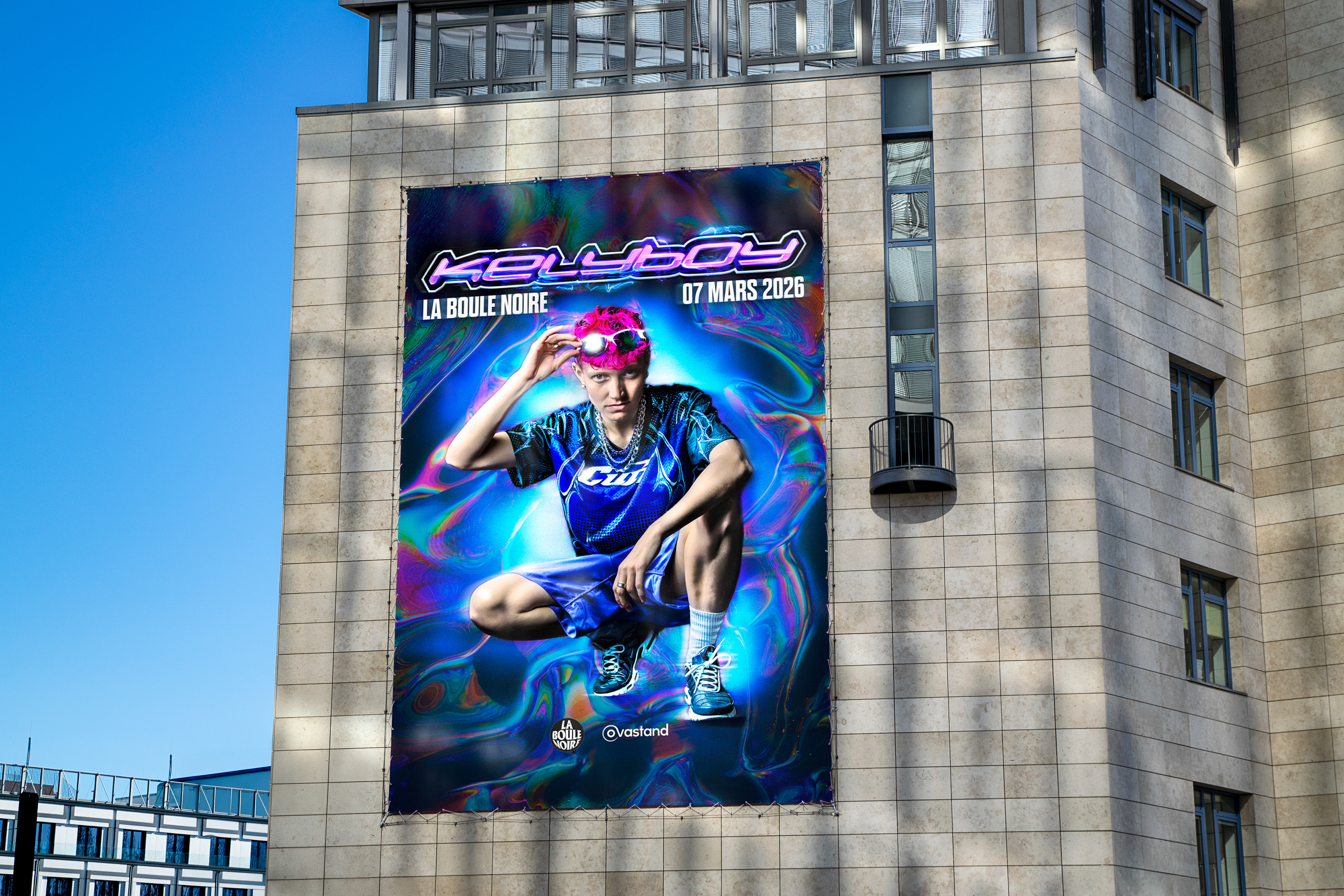 Pour la toute première date solo de @kelyboy_music à Paris, on s’est clairement mis d’accord qu’il fallait être efficace pour marquer le coup et proposer un visuel lisible, direct et percutant, centré sur ce beau portrait fort et lumineux signé @sachafemme, et dans la continuité de l’esthétique colorée et numérique qui fait déjà l’identité visuelle de Kelyboy.