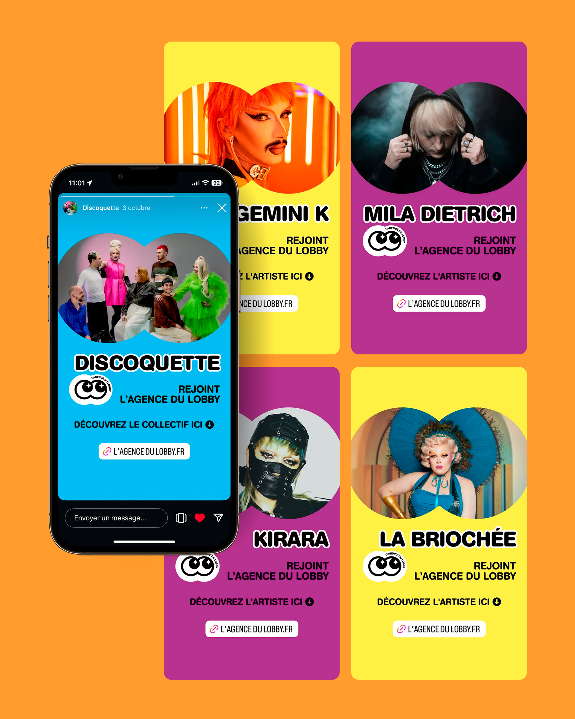 En plus du logo, j’ai conçu plusieurs templates pour les posts et stories de présentation des artistes sur Instagram, ainsi qu’une base pour les presskits. La communication repose sur quatre couleurs significatives : le jaune pour les artistes drag, le violet pour les DJs, le bleu pour les collectifs, et le rose en couleur principale. Chaque support met en valeur une photo des artistes intégrée dans un cadre reprenant la forme du logo, avec celui-ci placé dans le coin inférieur gauche pour une identification immédiate.