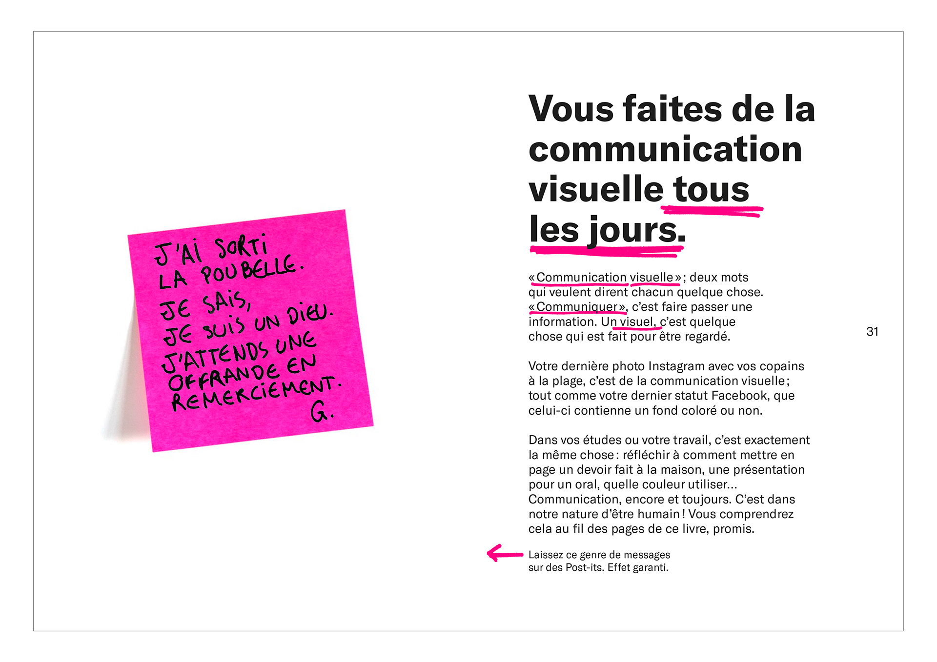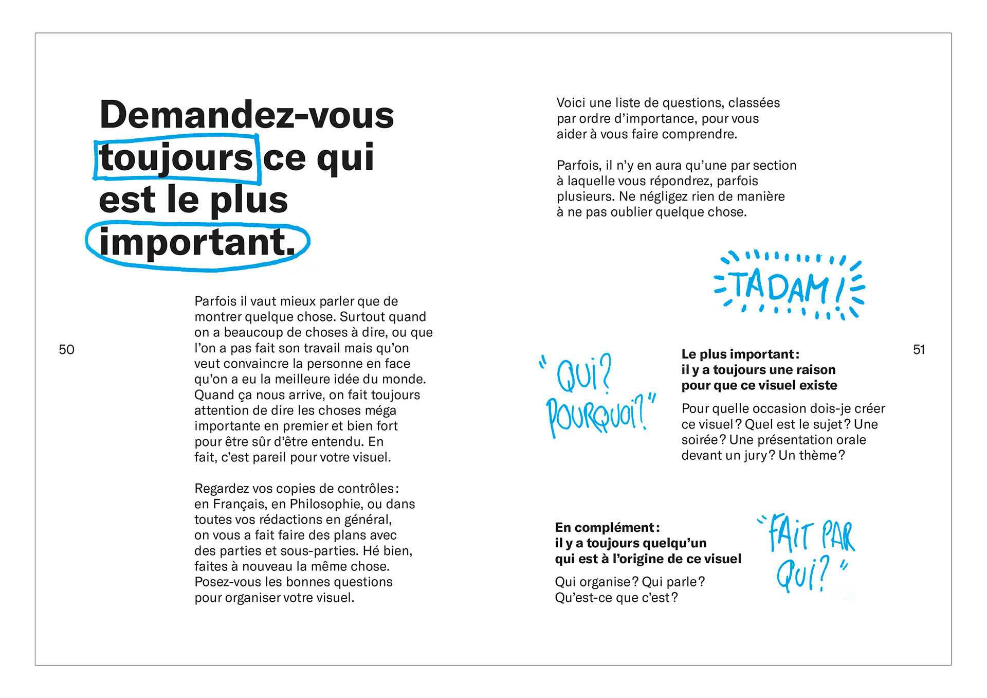 L'idée de ce projet est de sensibiliser les lycéens et leurs professeurs au design graphique de manière très intuitive, à l'aide d'un manuel explicatif proposant des possibilités d'améliorer ses travaux visuellement, et surtout de comprendre l’intérêt du design graphique. Par extension, ce manuel s'adresse à tous ceux qui souhaitent découvrir le monde visuel dans lequel nous évoluons tous, ses règles, ses principes, et son mode de fonctionnement.