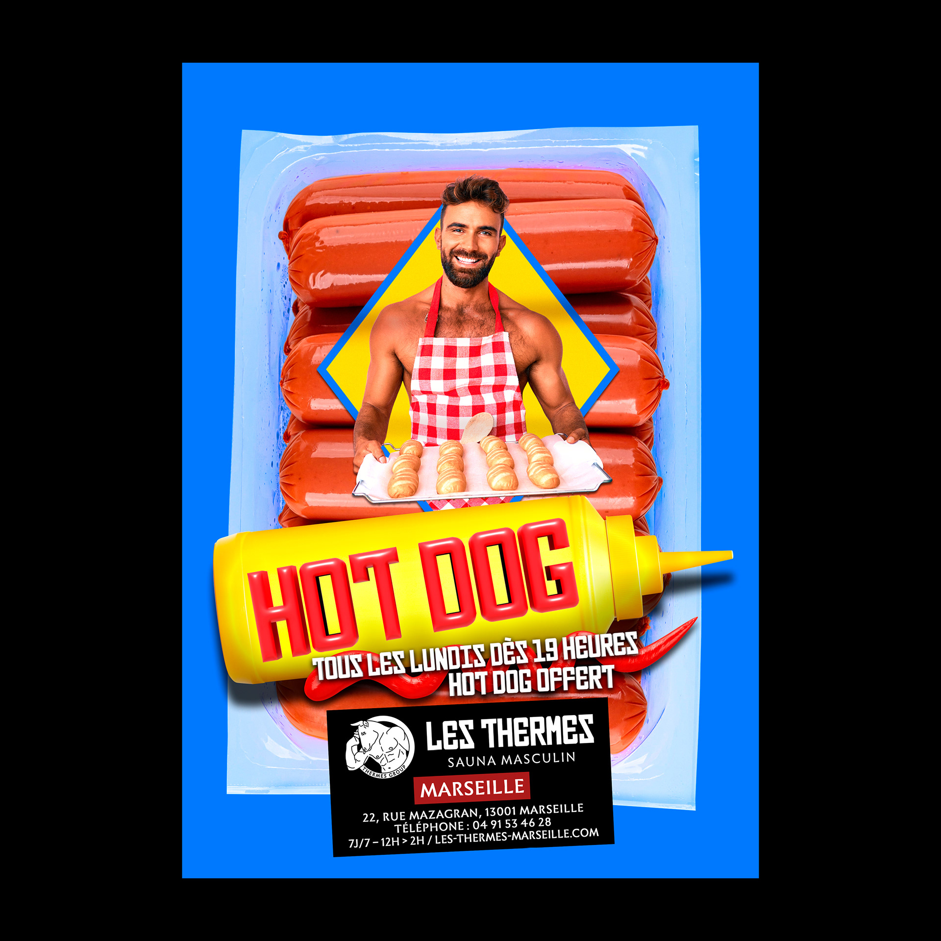 LES THERMES – HOT DOG // Une soirée avec des saucisses dans un sauna masculin… Mes clients ont de l’humour! 😆 Pour éviter de tomber dans le cliché facile et peut-être un peu lourdingue, j’ai choisi de créer un habillage de paquet de saucisses agrémenté d’éléments en presque 3D. Dans une situation où l’image en tête peut être trop forte et attendue, c’est toujours plus sympa quand l’idée est suggérée de manière différente