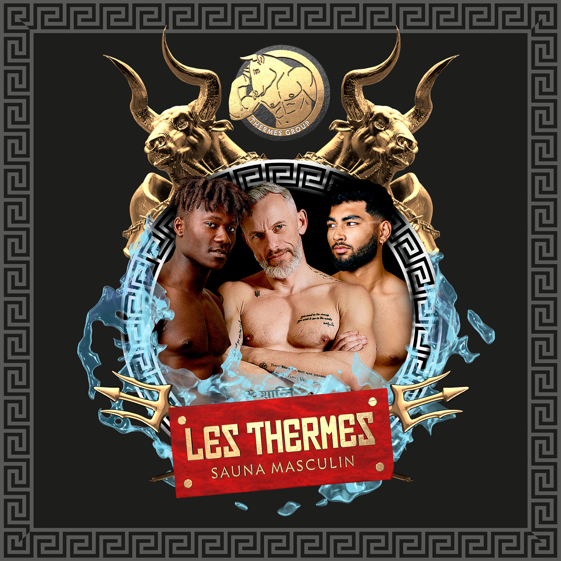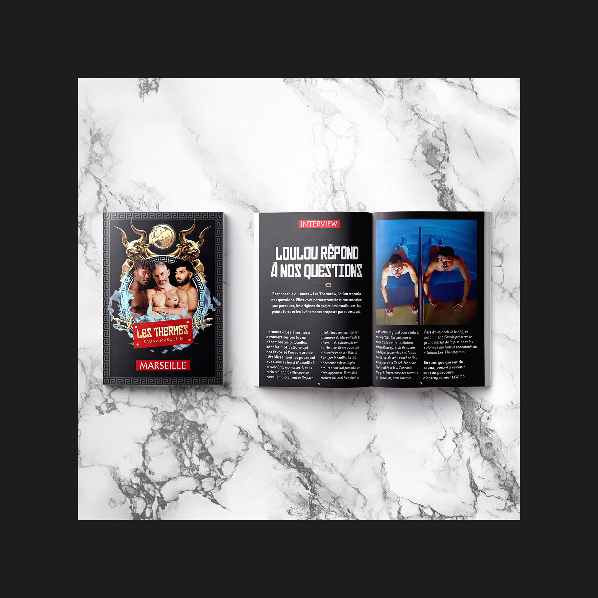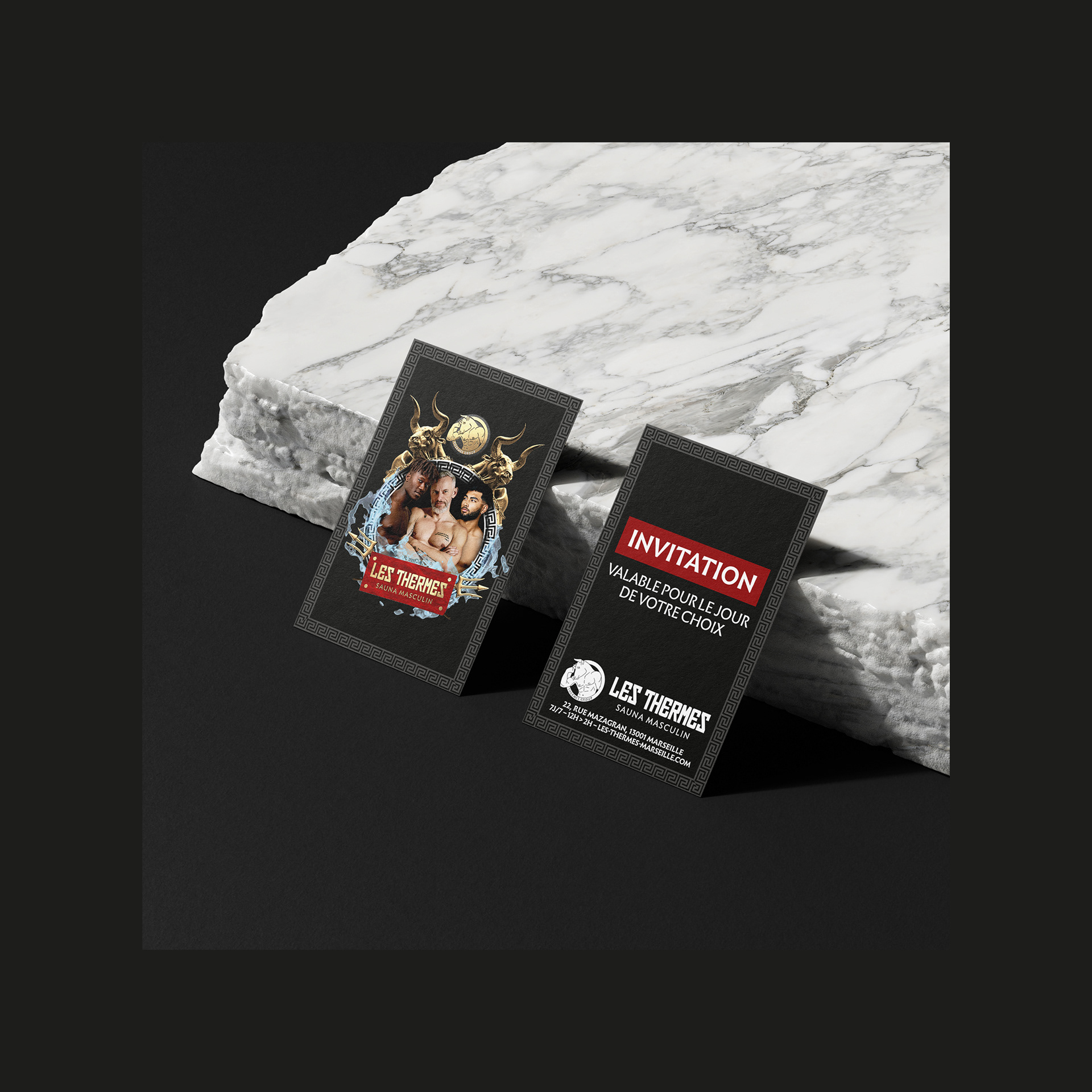 Depuis sa réouverture en 2019, je m'occupe des visuels du sauna masculin marseillais Les Thermes et de son identité. Deux ans plus tard, nous poussons un peu plus l'identité visuelle du sauna vers une identité plus reconnaissable et caractéristique, et aussi plus représentative du public du sauna.
