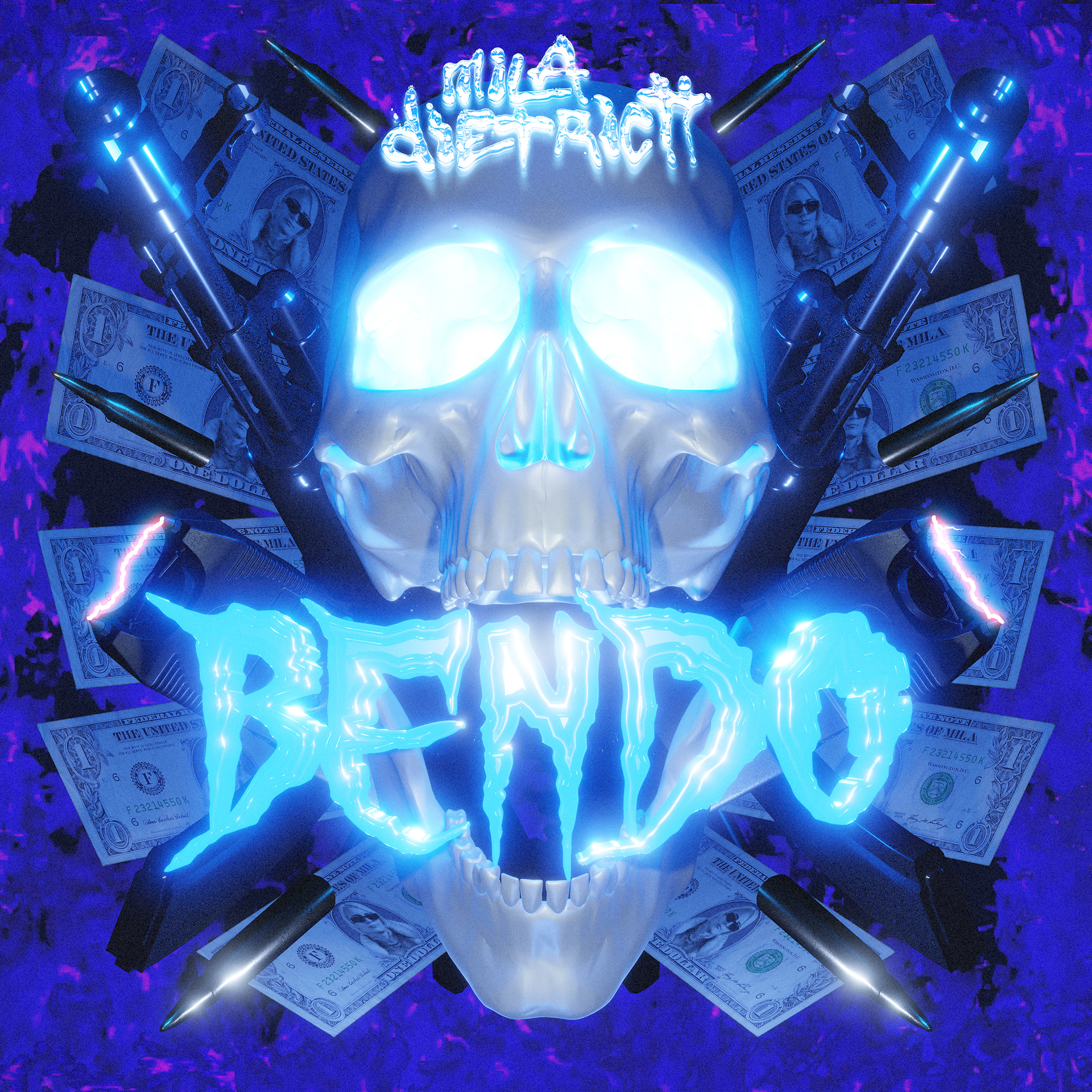 💀🔫💵 🔥 💿 MILA DIETRICH - BENDO // Pour ce nouveau single de @miladietrichmusic, l’idée de base était de partir sur un visuel inspiré des pochettes de Schemaposse, très axées typo coulantes et massives + gothique. Dans ma tête, c’est tout un univers de flammes et de squelettes en 3D qui est apparu ; il a donc fallu que je trouve un moyen de composer avec toutes ces idées, tout en restant dans l’univers du bendo (« quartier », « banlieue »). J’ai eu l’envie de construire une sorte de sculpture totémique très symétrique, à la fois immobile, légèrement vivante et en lévitation, d’où les petits éclairs des tasers et les balles qui semblent figées dans le temps. L’ensemble semble prendre vie dans les formats vidéos, ce qui me plaît encore plus. Bendo est disponible partout, aller l’écouter! 💀🔫💵 🔥 💿