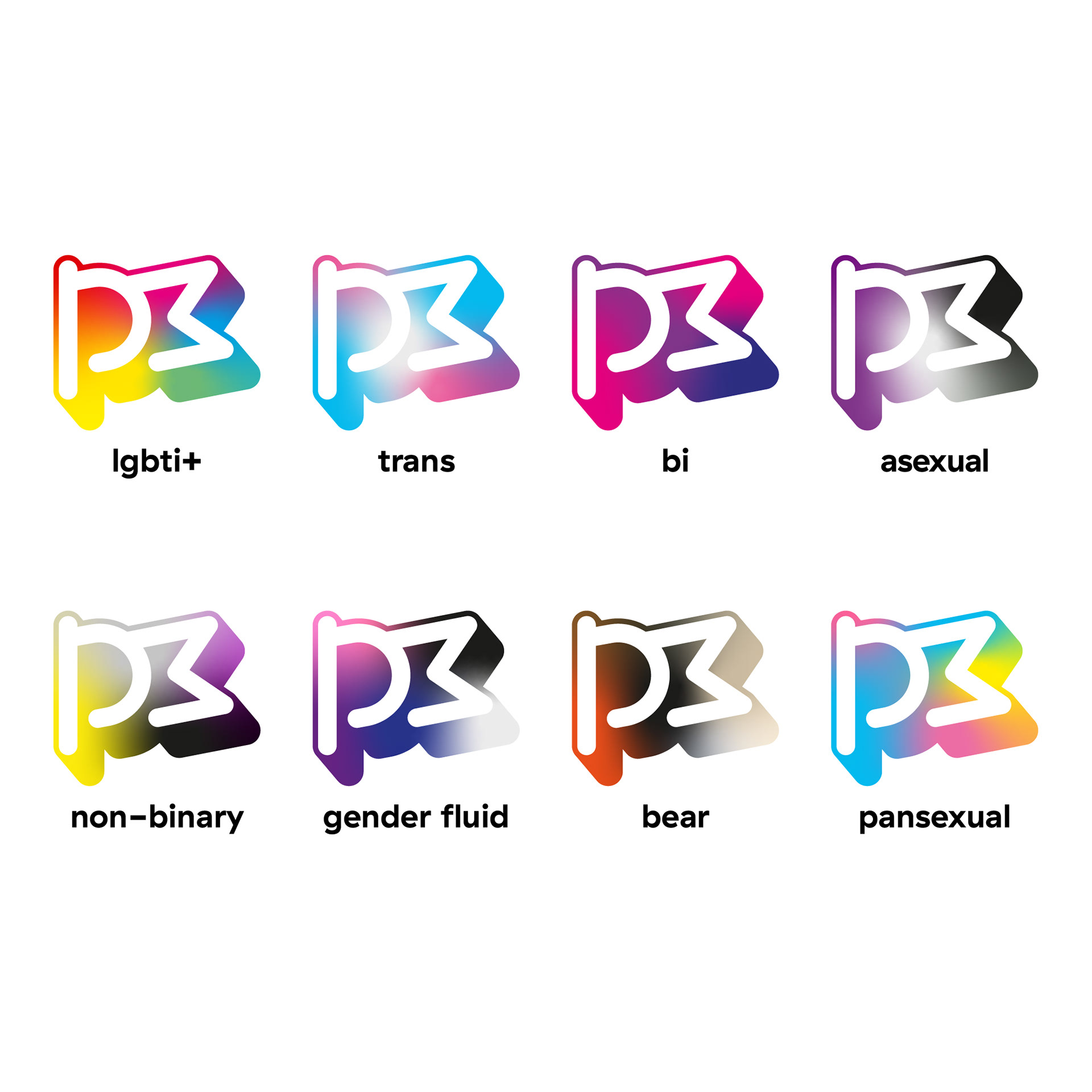 The P and the M stick in a way to create a pole wearing sometimes a rainbow flag, or the many coloured flags of the LGBTQ+ communities.