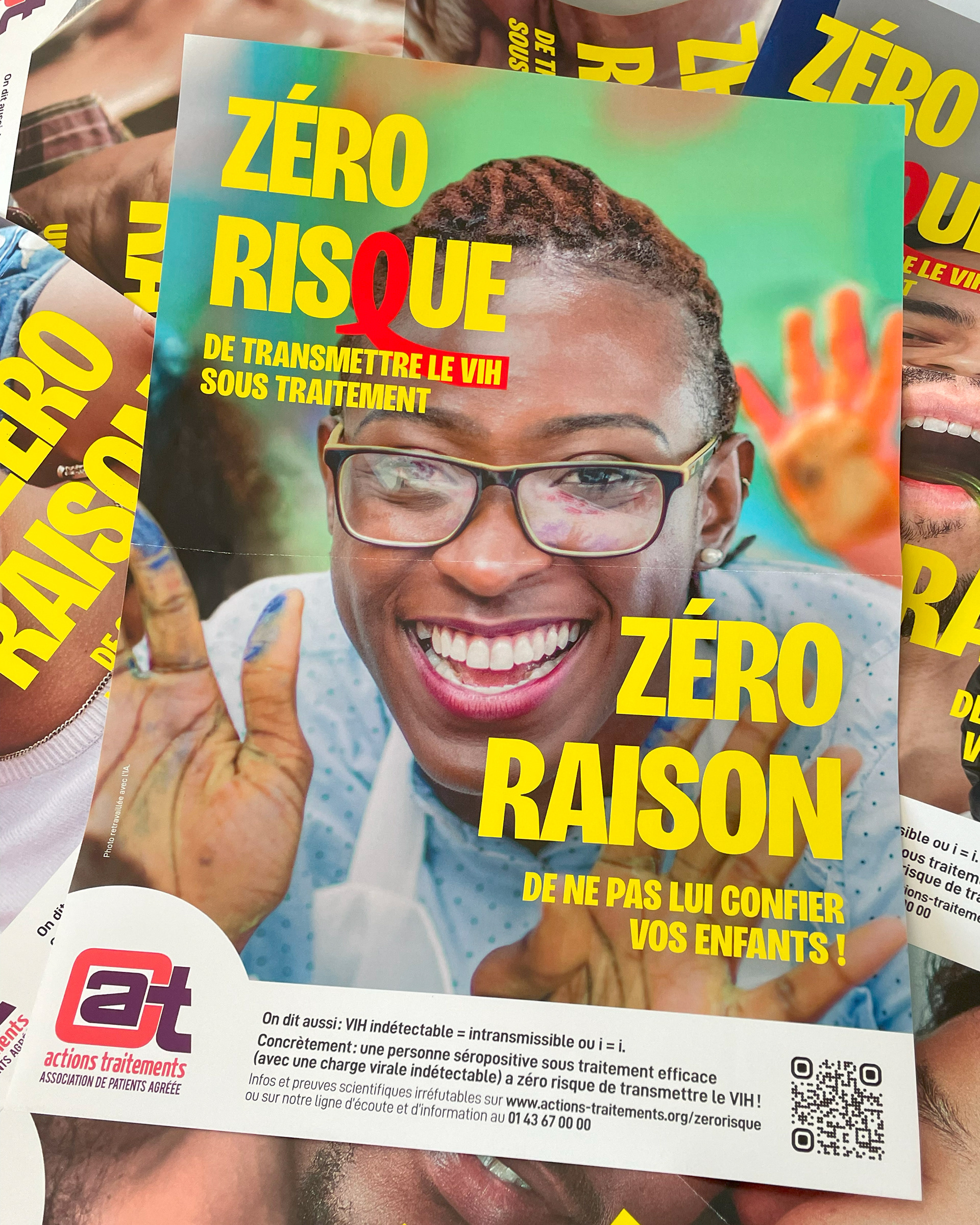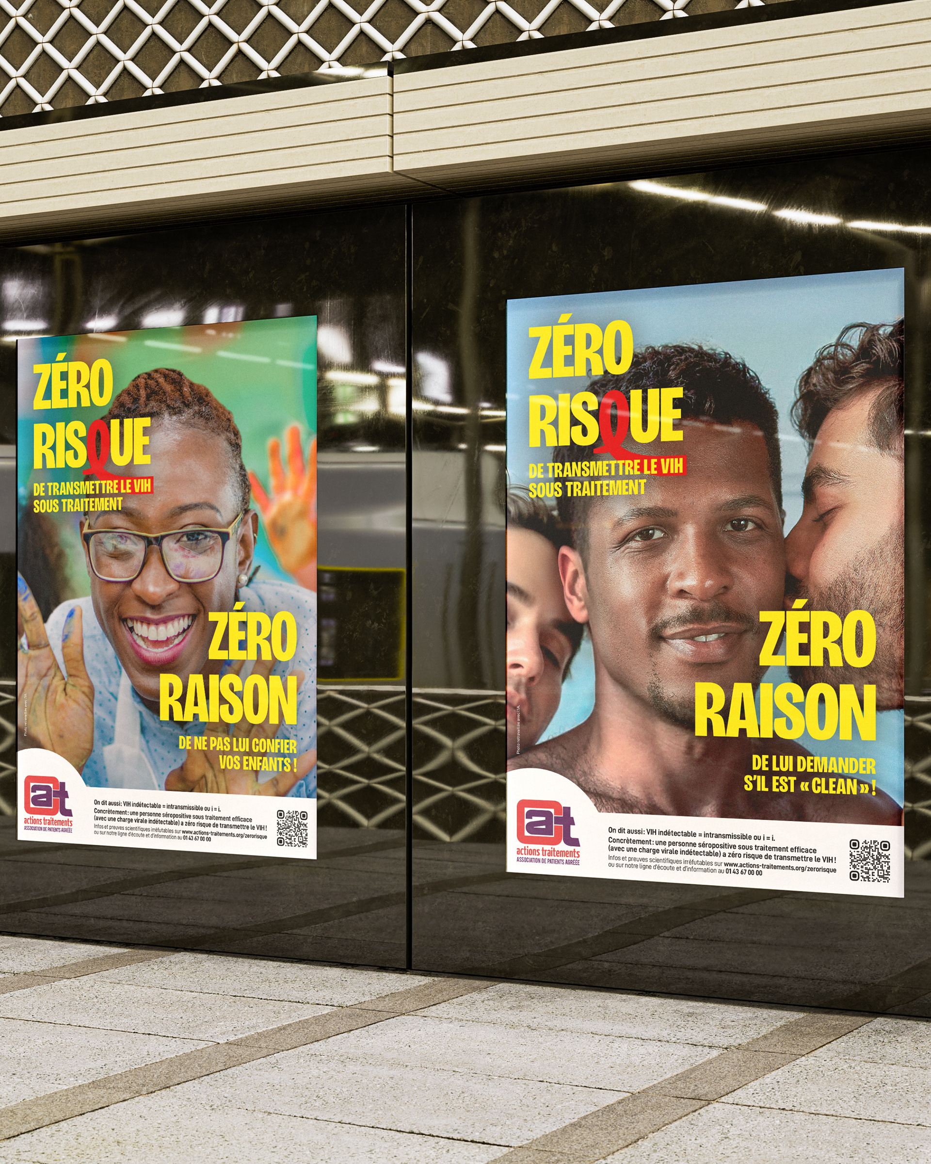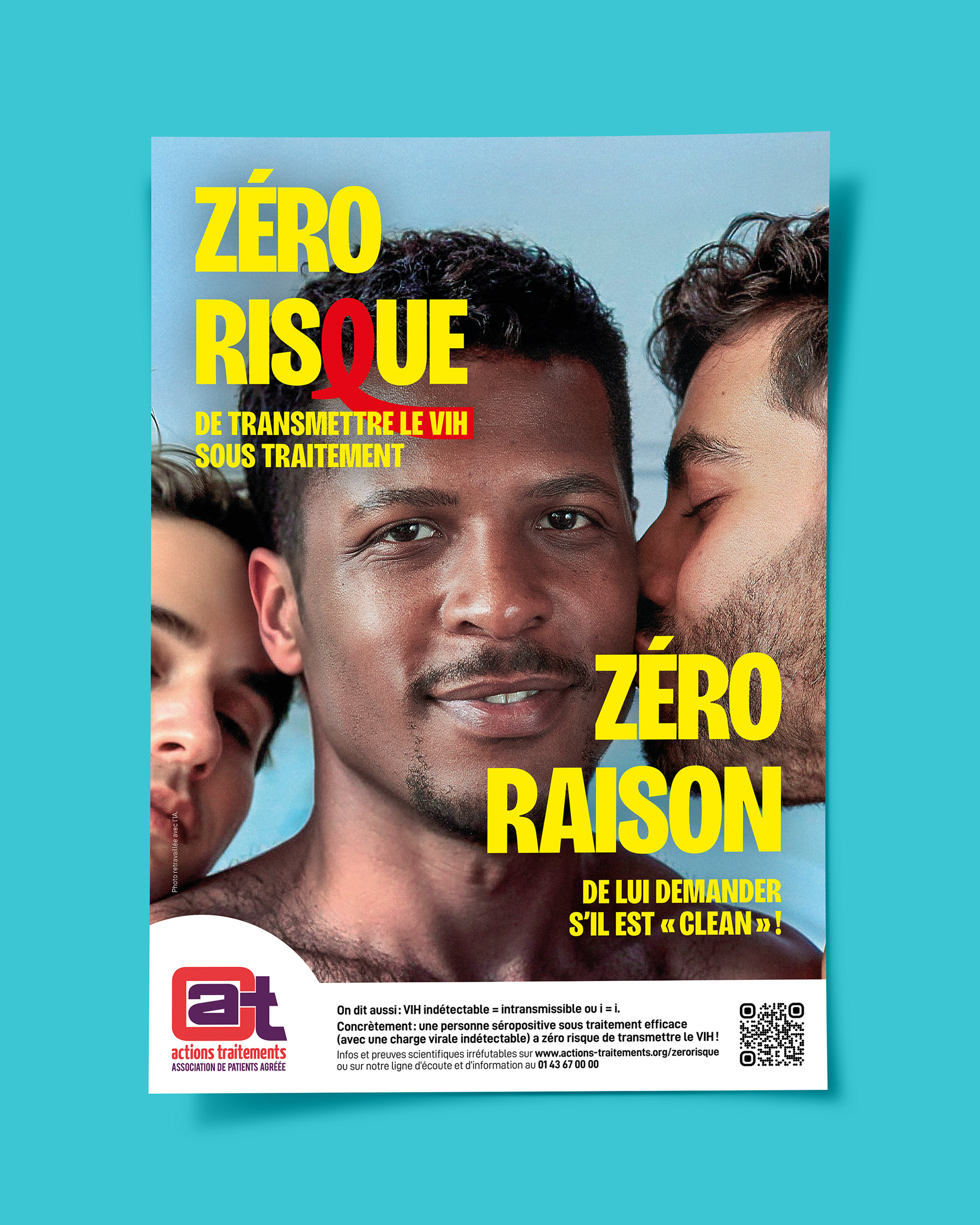 Fin 2024, nous avons conçu avec @actions_traitements une campagne qui vise à sensibiliser le public au fait qu’une personne vivant avec le VIH, sous traitement efficace et avec une charge virale indétectable, ne peut pas transmettre le virus. Intitulée “Zéro Risque”, elle se compose d’une série de six visuels mettant en scène des personnes fictives dans des situations du quotidien où elles peuvent être confrontées à la sérophobie (discrimination au travail, sur les applis de rencontres, chez le médecin, etc.), et affirme clairement que oui, “Zéro risque de transmission = Zéro raison de discriminer”. L’objectif est de faire évoluer les mentalités et de diffuser largement le message “Indétectable = Intransmissible”, et de mettre en avant l’humain avant le VIH, à travers des visages heureux et centraux.