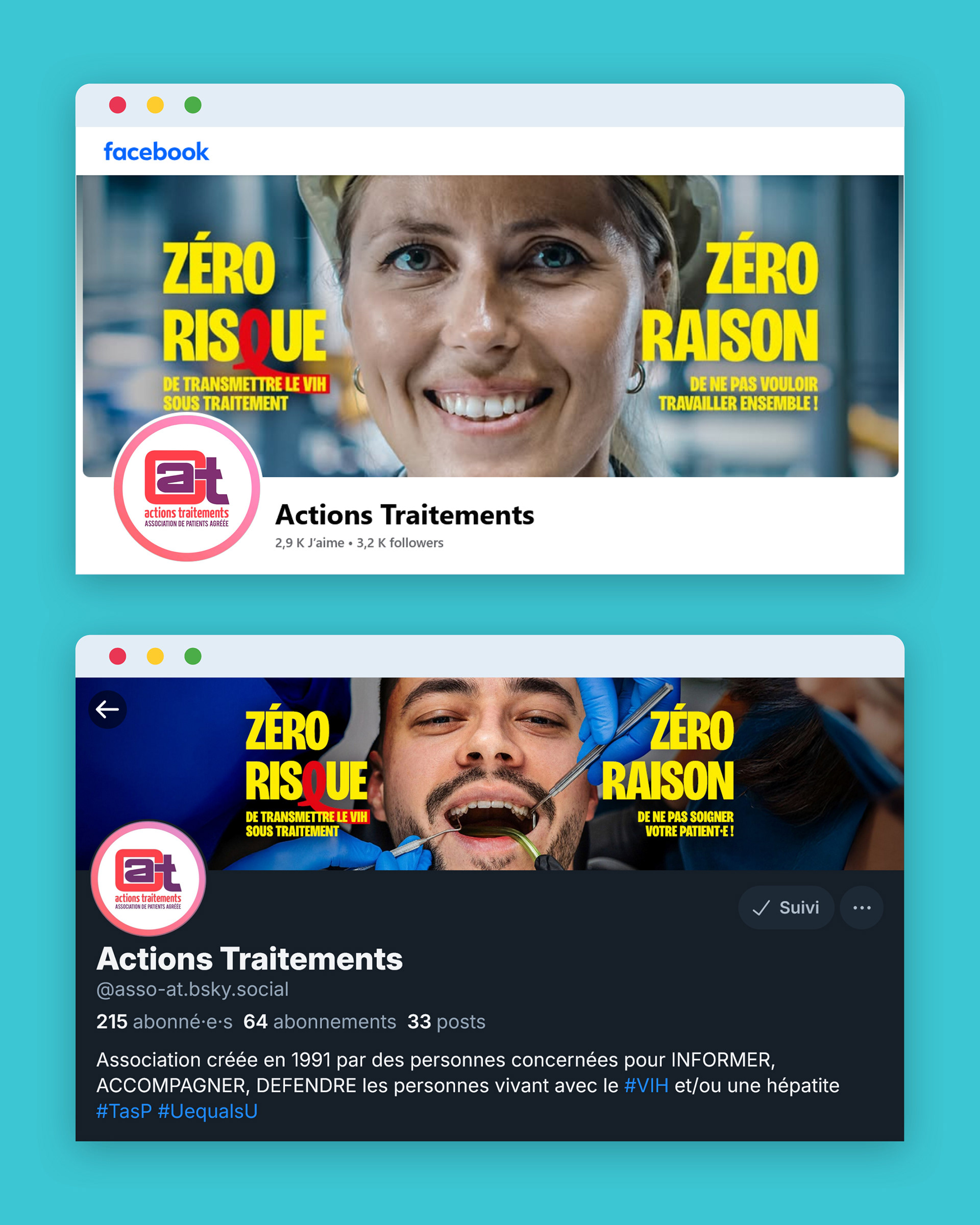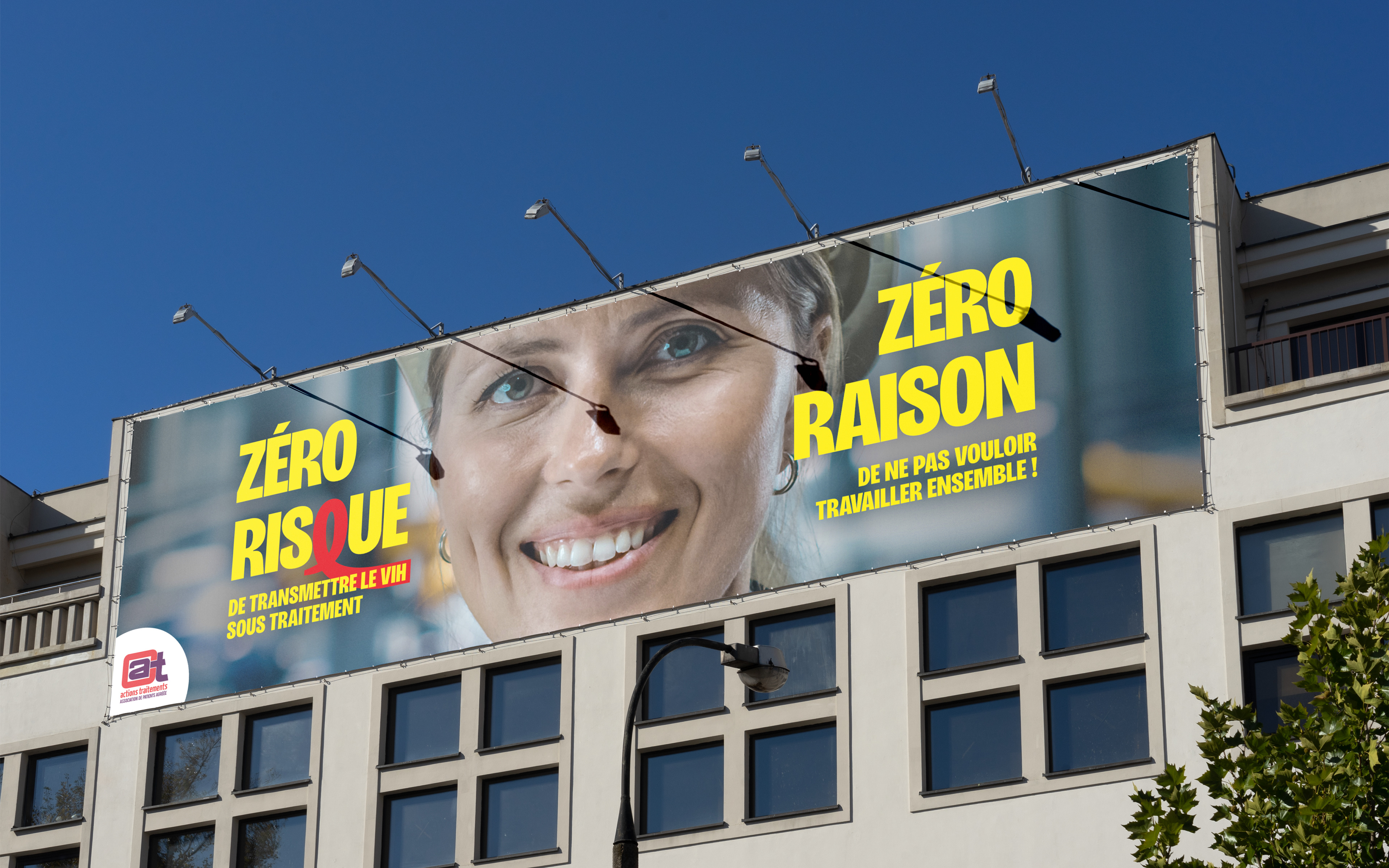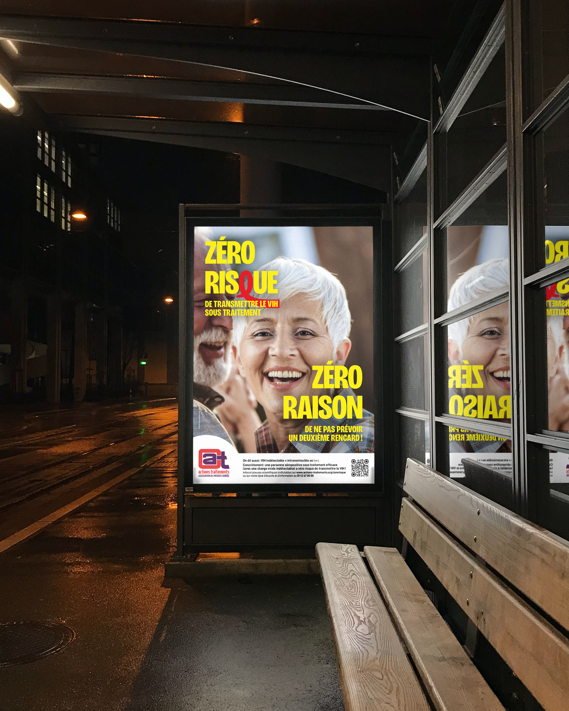 Fin 2024, nous avons conçu avec @actions_traitements une campagne qui vise à sensibiliser le public au fait qu’une personne vivant avec le VIH, sous traitement efficace et avec une charge virale indétectable, ne peut pas transmettre le virus. Intitulée “Zéro Risque”, elle se compose d’une série de six visuels mettant en scène des personnes fictives dans des situations du quotidien où elles peuvent être confrontées à la sérophobie (discrimination au travail, sur les applis de rencontres, chez le médecin, etc.), et affirme clairement que oui, “Zéro risque de transmission = Zéro raison de discriminer”. L’objectif est de faire évoluer les mentalités et de diffuser largement le message “Indétectable = Intransmissible”, et de mettre en avant l’humain avant le VIH, à travers des visages heureux et centraux.