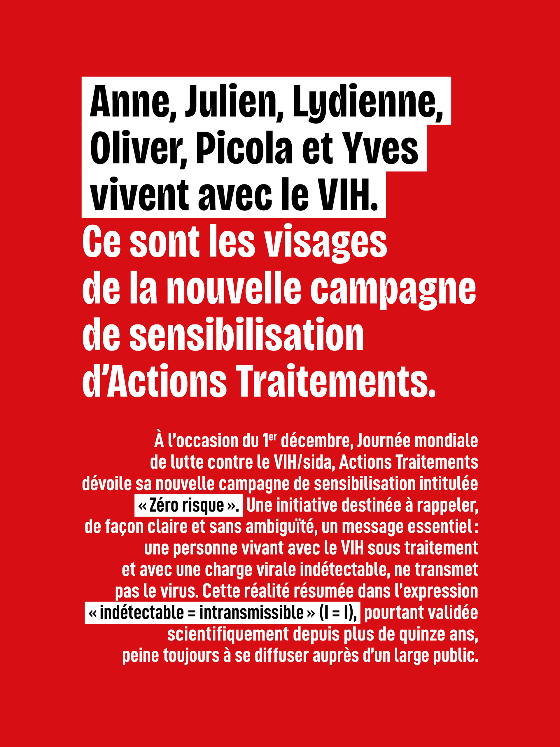 À l’occasion du 1er décembre, Journée mondiale de lutte contre le VIH/sida, Actions Traitements dévoile sa nouvelle campagne de sensibilisation intitulée « Zéro risque ». Une initiative destinée à rappeler, de façon claire et sans ambiguïté, un message essentiel : une personne vivant avec le VIH sous traitement et avec une charge virale indétectable, ne transmet pas le virus. Cette réalité résumée dans l’expression « indétectable = intransmissible » (I = I), pourtant validée scientifiquement depuis plus de quinze ans, peine toujours à se diffuser auprès d’un large public. […]